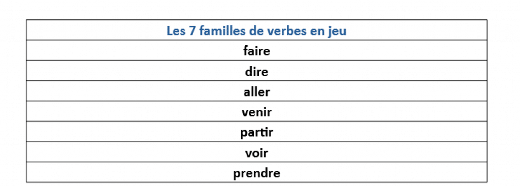 Vous pouvez faire jouer de 3 à 7 élèves. Comme il n’y a que 3 cartes par famille, vous trouverez également une planche à donner aux élèves pour qu’ils sachent quelles familles de verbe demander.