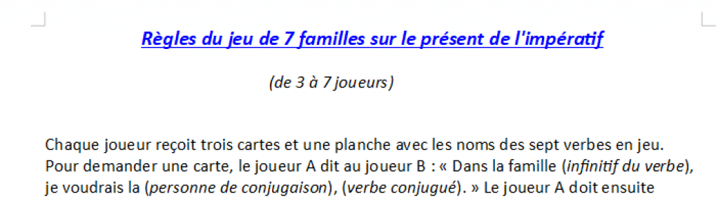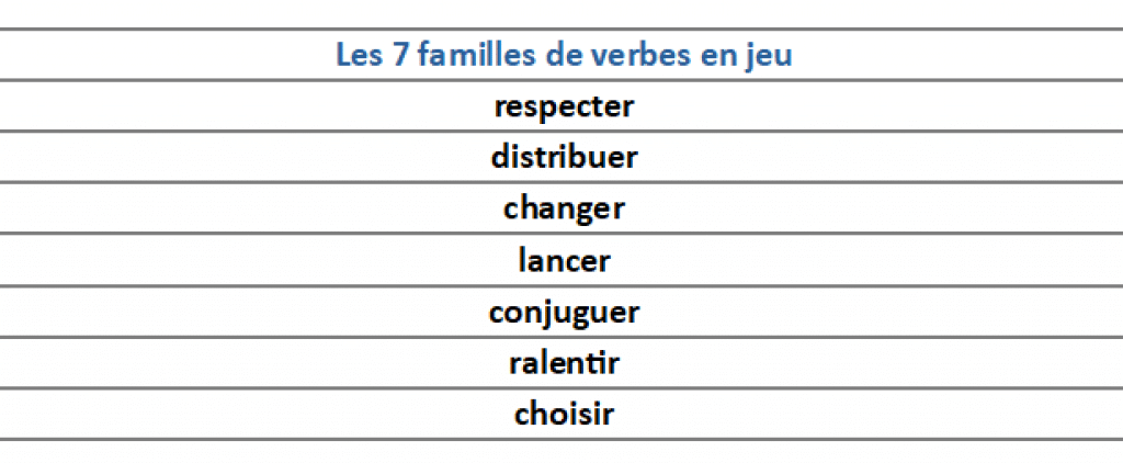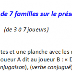 Vous pouvez faire jouer de 3 à 7 élèves. Comme il n’y a que 3 cartes par famille, vous trouverez également une planche à donner aux élèves pour qu’ils sachent quelles familles de verbe demander.