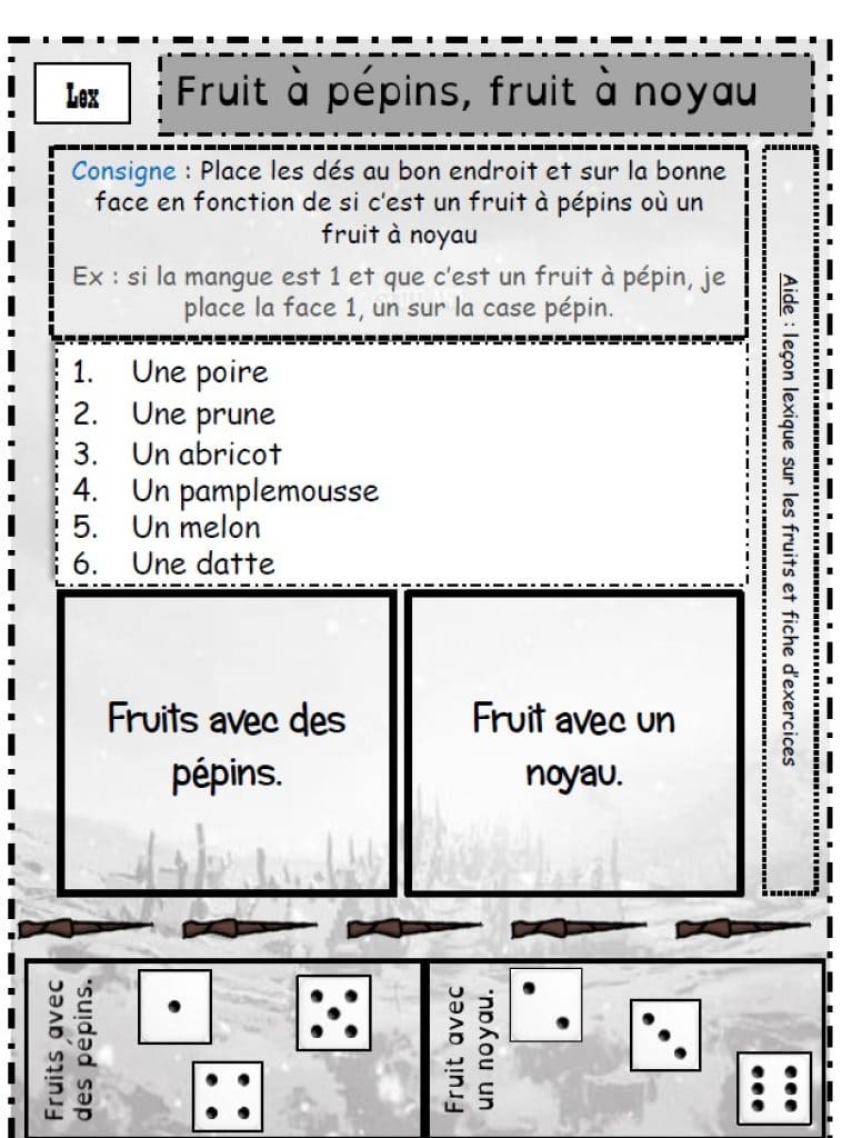 Jeu de révisions sur les fruits avec des dés en lien avec l’ouvrage les ateliers de Lexique au CE2 (Hachette)