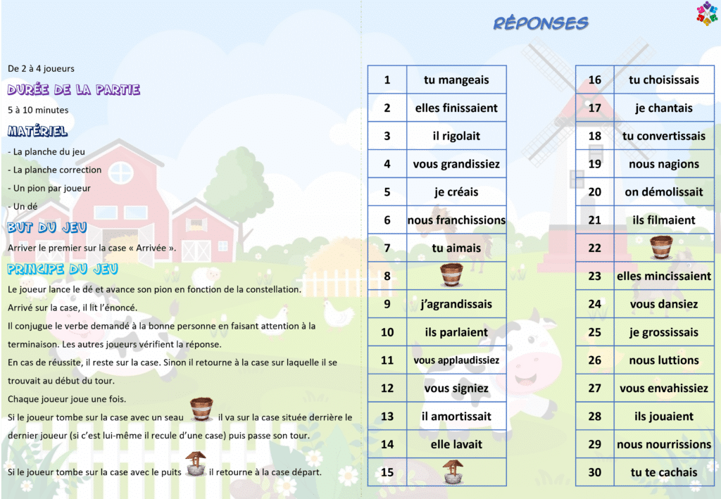 Vous recevrez un plateau de jeu accompagné d’une page de réponses, offrant ainsi aux élèves la possibilité de jouer en toute autonomie. Chaque plateau suit un schéma similaire pour instaurer une routine chez les apprenants et faciliter leur immersion dans les activités. Ces plateaux sont colorés et attrayants, ce qui rend l’apprentissage de la conjugaison à la fois ludique et captivant pour les élèves. Chacun d’entre eux comporte des instructions simples sur la manière de conjuguer le verbe présenté.
