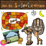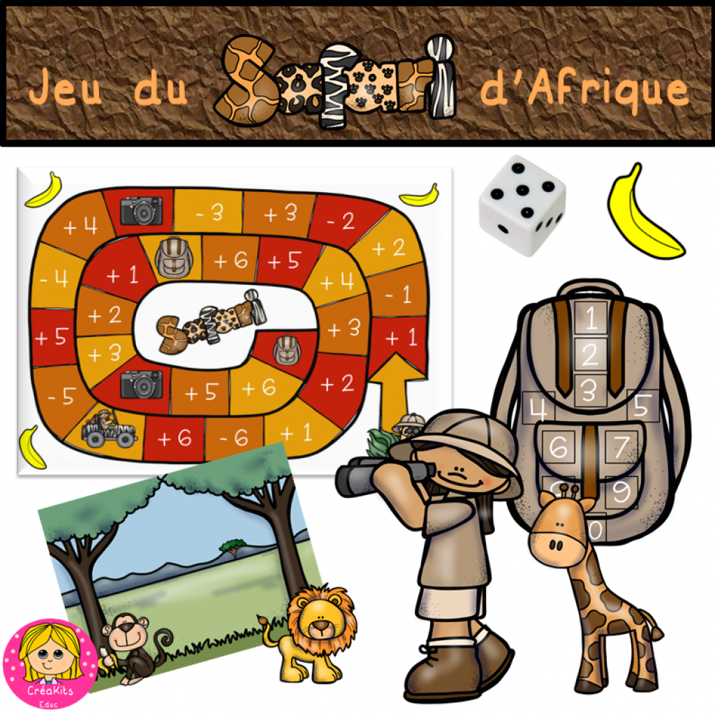 L’affiche du jeu en pdf et en png pour ranger le jeu dans une enveloppe, une pochette… et sse repérer lors du rangements des supports de la classe, les explications du jeu, le plateau, les pions personnages que vous pouvez insérer dans une petite boule de pâte à modeler ou autre pour les faire tenir debout, les jetons bananes, les sacs à dos, les planches paysage, les animaux.