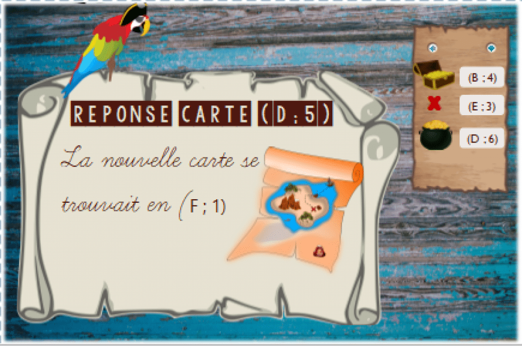 Exemple: Sur la première carte, tu découvres que la seconde se trouve en (F ; 2), tu peux alors piocher la carte (F ; 2) la résoudre puis piocher la troisième carte.