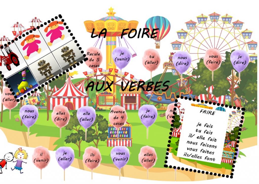Jeu de plateau comprenant le plateau A4 ou A3, la règle du jeu, des cartes jouets à remporter et des mémos avec la conjugaison des verbes pour que les enfants puissent jouer en autonomie.