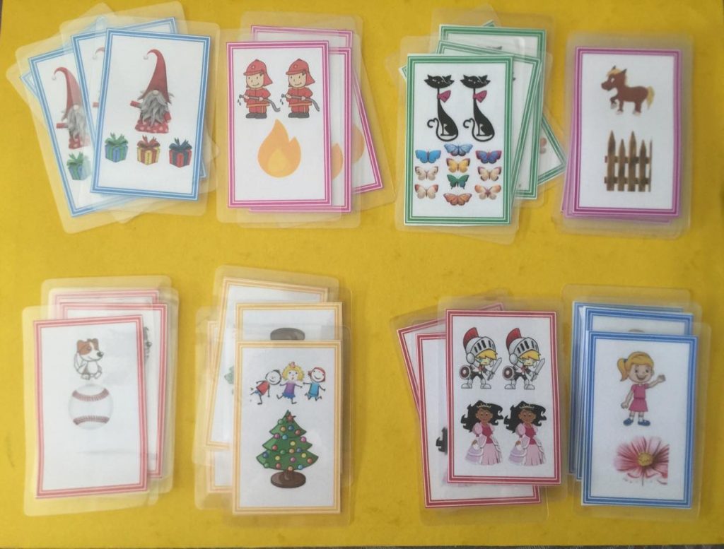 – L’enfant choisit un lot d’images : 4 vignettes représentant une scène. Sur chaque vignette, un personnage et un objet ou un autre personnage. 4 situations