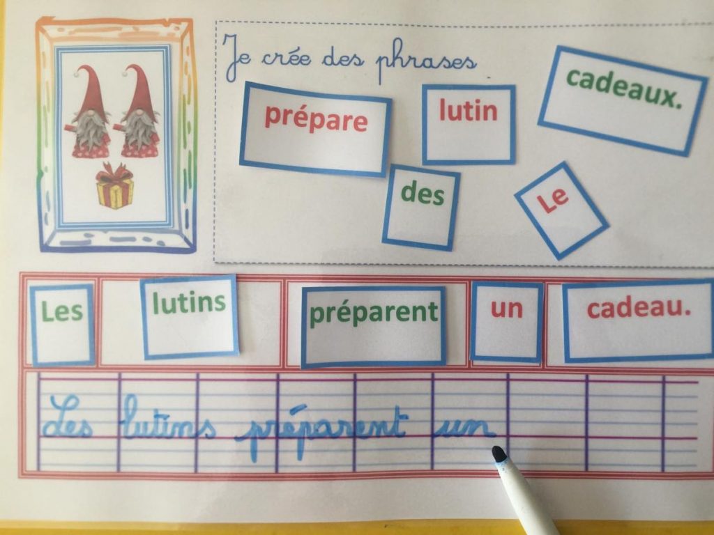 – L’élève écrit la phrase au feutre d’ardoise sur la fiche.
