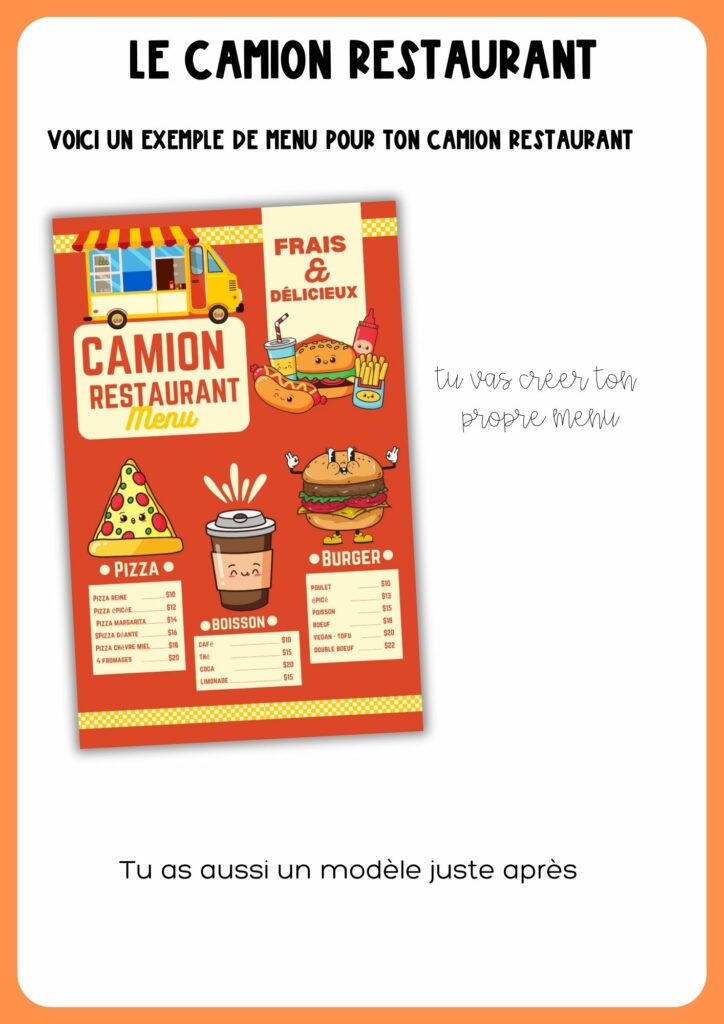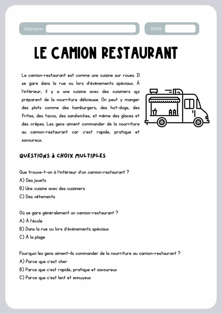 Le projet Un Camion Restaurant embarquera vos élèves dans une compréhension de lecture avec des questions à choix multiples, la conception du menu et la décoration du camion lui-même. Ils travailleront également sur les articles partitifs associés à la nourriture.