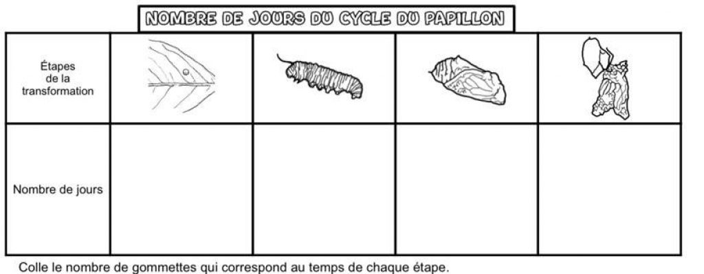 Page 2 : tableau : coller des gommettes ou dessiner des points selon le nombre de jours. ( vous aurez besoin d’avoir complété la chrysalide p 4,5 et 6 : toutes les infos y sont reprises)