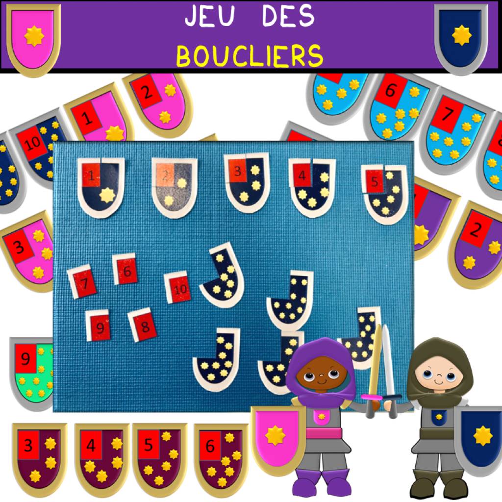 Ce jeu contient 6 séries de boucliers qu’il faut reconstituer en associant chiffre et quantités de 1 à 10.