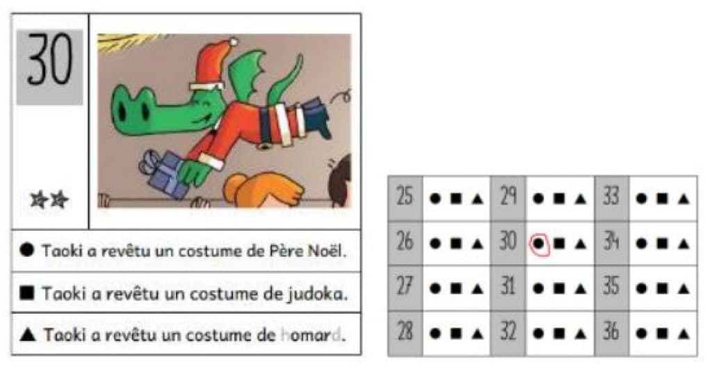 Les élèves doivent retrouver la phrase qui correspond à l’image parmi trois phrases et entourer sur leur fiche réponse la forme correspondante.