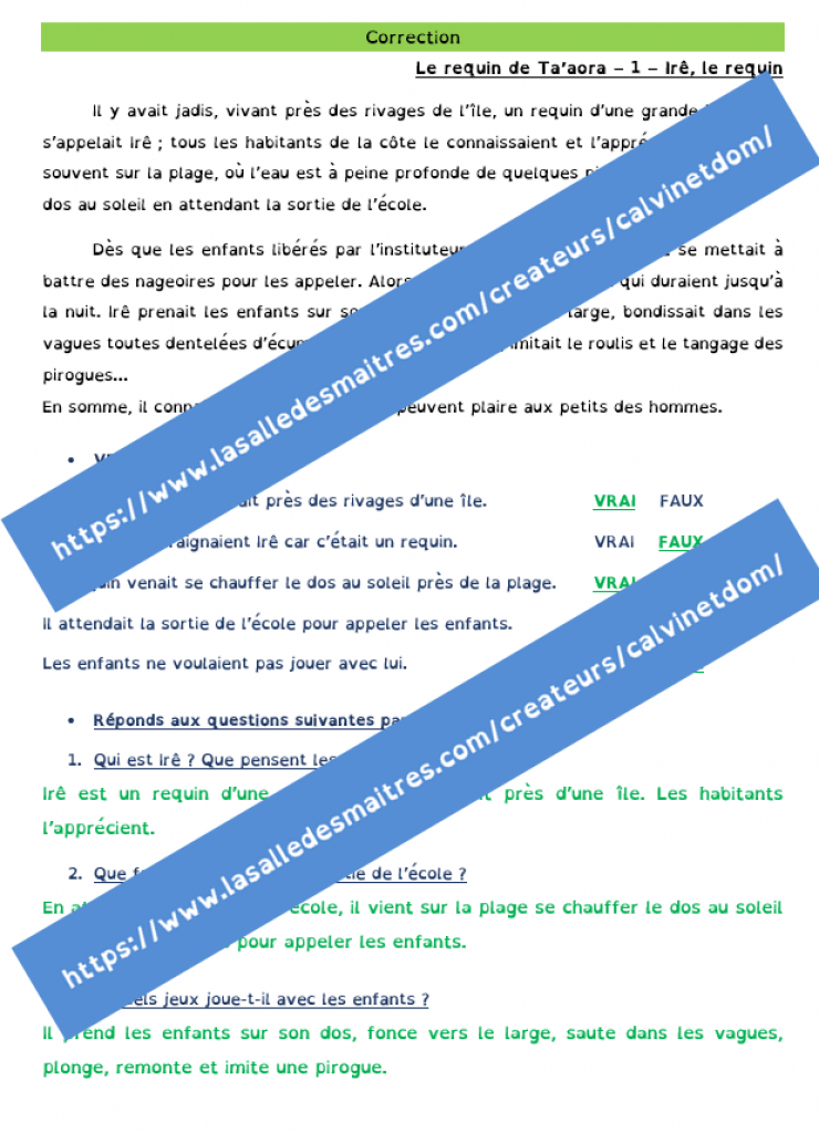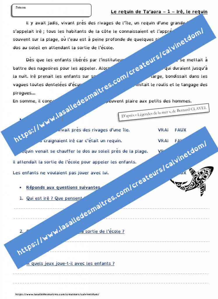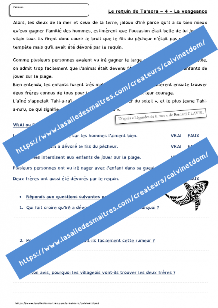 Chaque page contient une partie du texte de la légende du requin de Ta’aora (extrait des « Légendes de la mer » de Bernard CLAVEL) accompagnée par des questions de compréhension sur la partie inférieure.