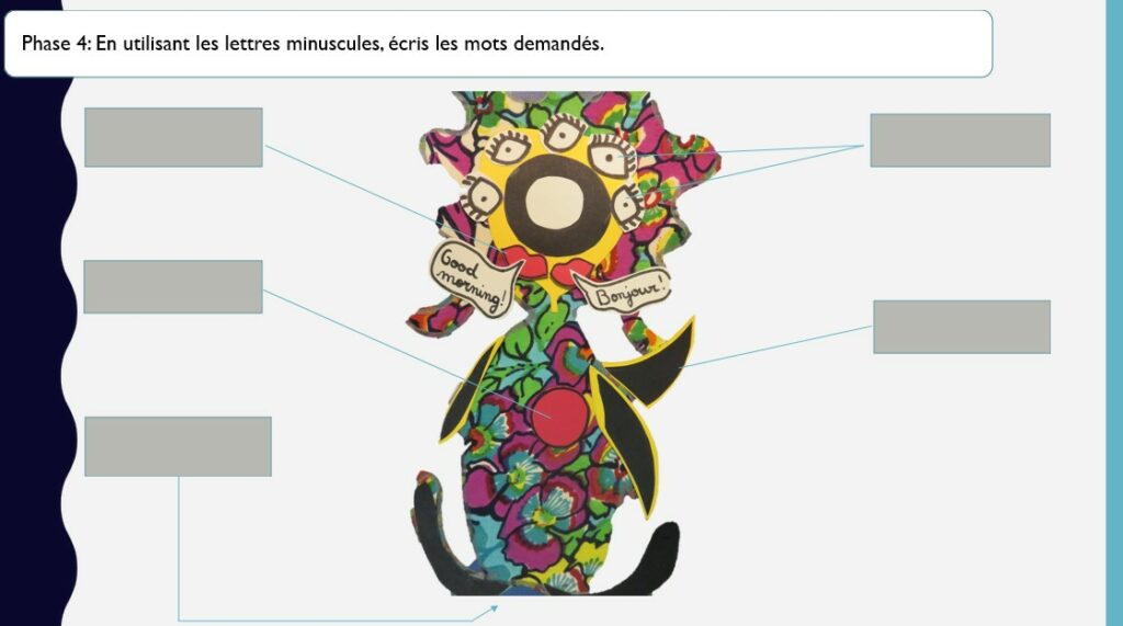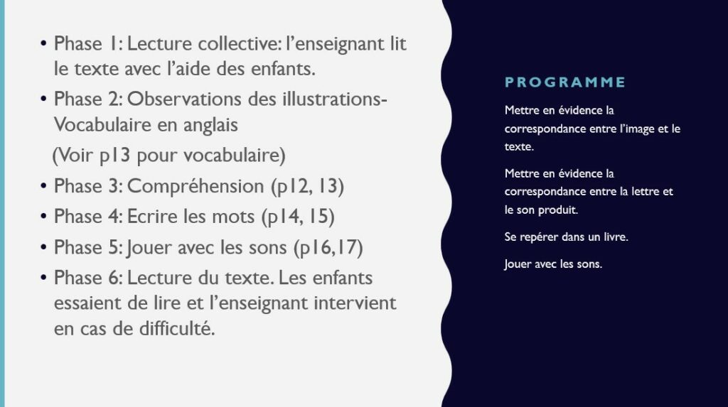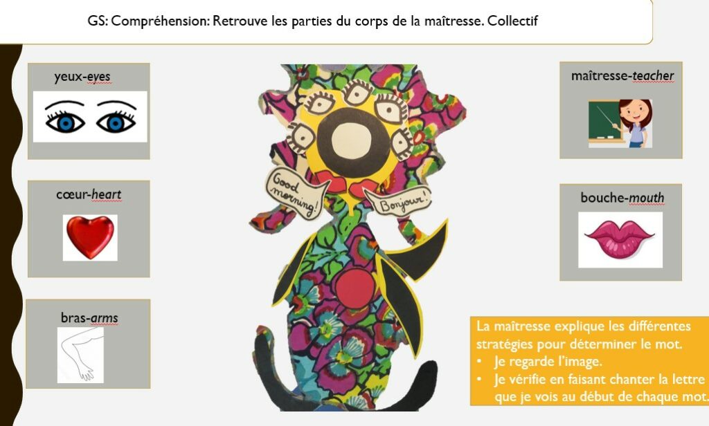 Ce que je propose, c’est de faire entrer les enfants dans la lecture (images connectées au texte, lettres connectées aux sons) au travers d’une histoire intitulée MA MAÎTRESSE EST CHOUETTE.