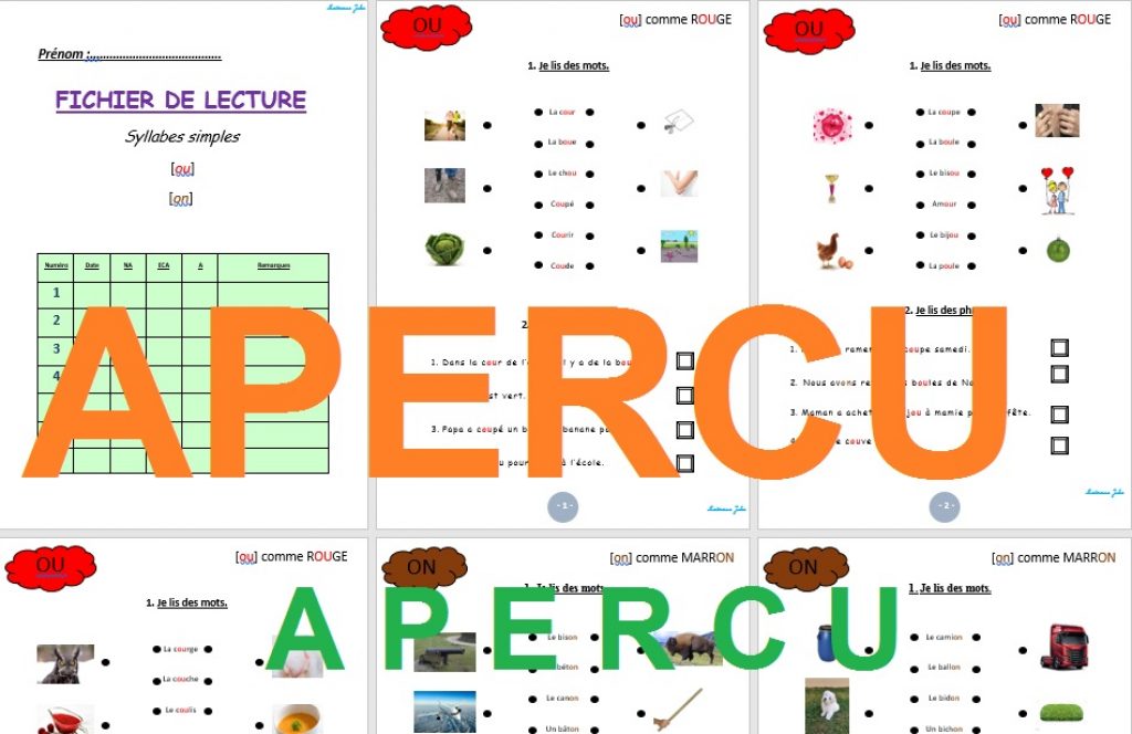 – page de garde avec rappel des codes de lecture des sons [ou] et [on].