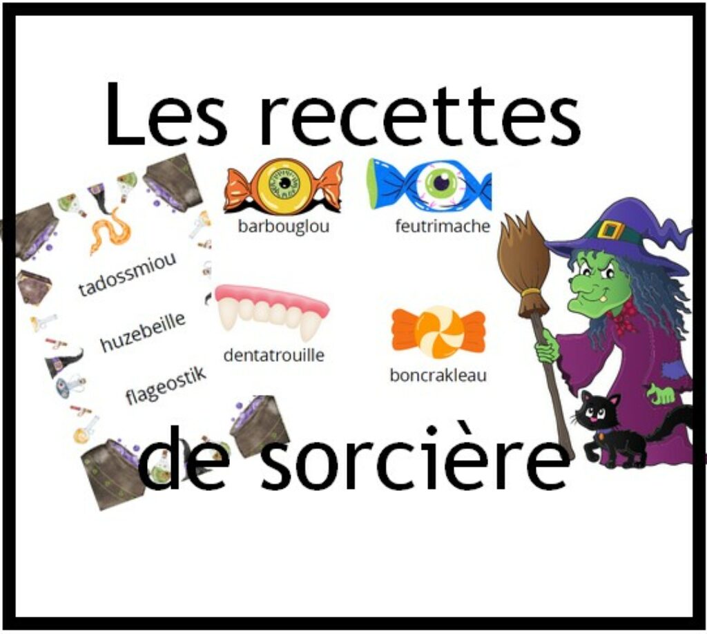 Un élève prend une recette , lit les ingrédients (pseudo-mots) à la sorcière ou au sorcier qui doit préparer la recette (mettre les ingrédients dans un faux chaudron ou dans une gobelet…). L’élève qui lit la recette vérifie que la sorcière (ou sorcier) a donné les bons ingrédients.