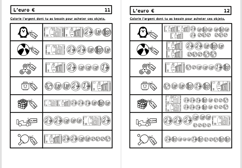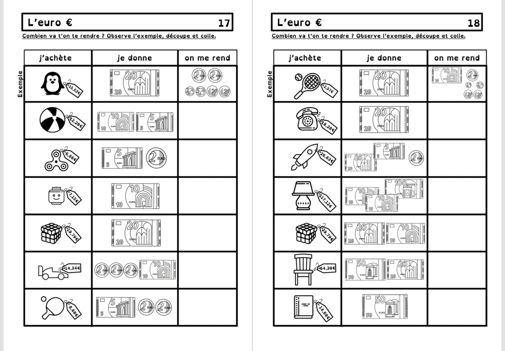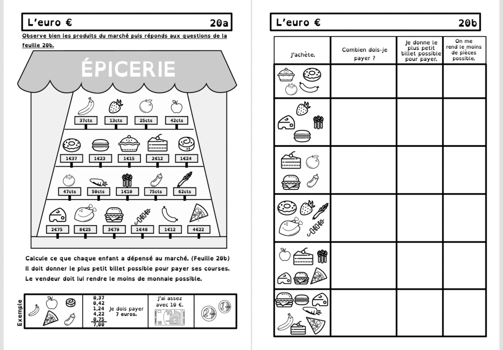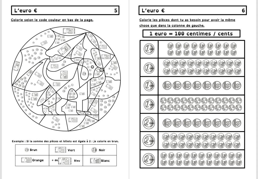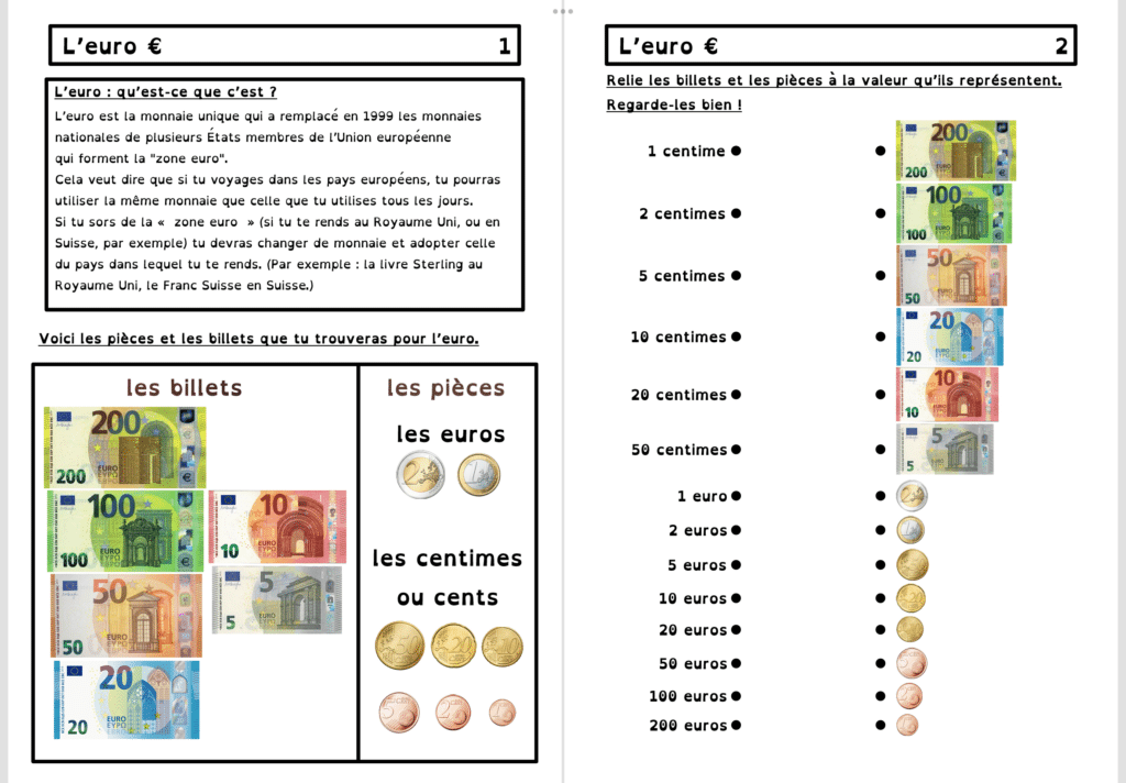 Vous trouverez dans ce dossier tout ce qu’il faut pour travailler l’euro, depuis les billets jusqu’aux centimes. Le correctif est fourni !