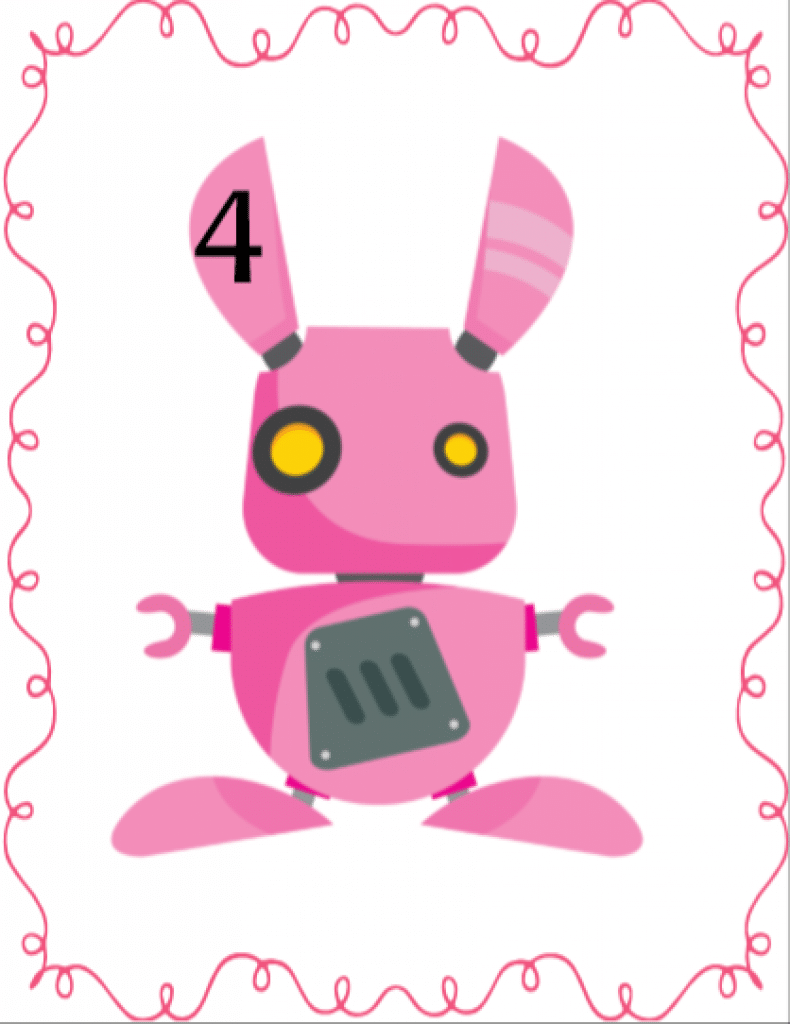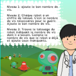 Niveau 2; Chaque robot a un chiffre de tatoué. C’est le nombre de vis nécessaires pour le guérir. Ajoute le bon nombre de chiffre.