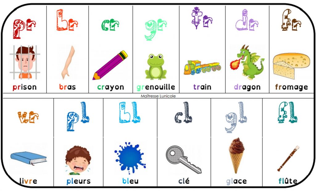 Voici un mémo autour des confusions de sons (pr, br, cr, br, pl, bl, cl…) utilisable de différentes manières. Pour ma part, j’utilise la version avec Alphas pour les CP (lorsque les sons ont été vus) en affichage, tandis que j’utilise la version avec les lettres capitales et cursives en guise de sous-main plastifié pour les CE1 qui en auraient besoin.