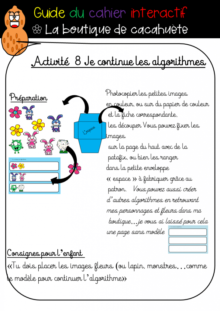 -Je vous fournis aussi la fiche de présentation de cacahuète qui vous indique comment procéder pour préparer chaque activité et la consigne à donner aux élèves, ce qui vous permet de vous projeter en visualisant le contenu.