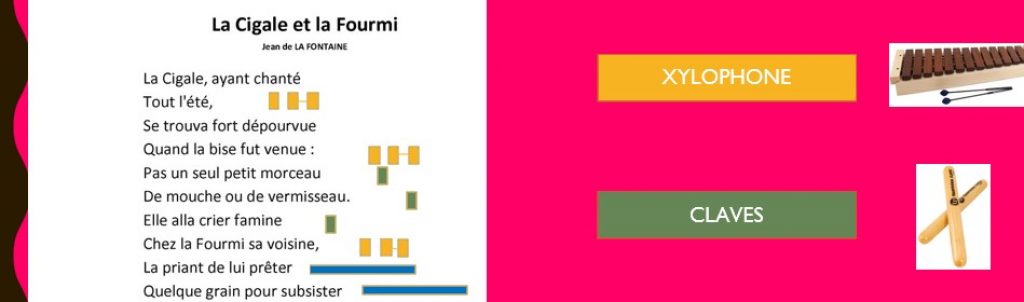3 groupes d’instruments de musique. (Ex Xylophone, Claves, Carillon tubulaire) : instruments souvent présents dans les écoles.