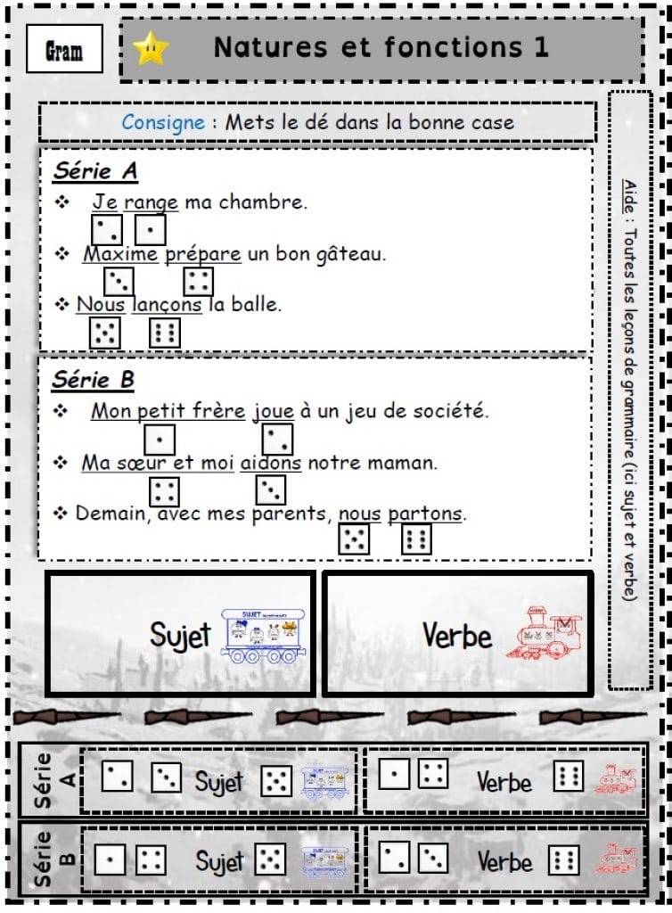 Il s’agit d’un jeu de dés pour faciliter l’analyse de phrase en grammaire au CE2 et CM1.
