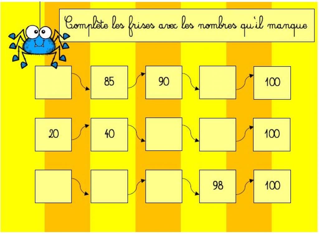 – Atelier 2 : Les frises jusqu’au nombre 100 (6 cartons de jeux : avec un feutre à ardoise, les élèves doivent compléter les frises numériques qui leurs sont proposées , 3 par carton de jeu. La correction est fournie).