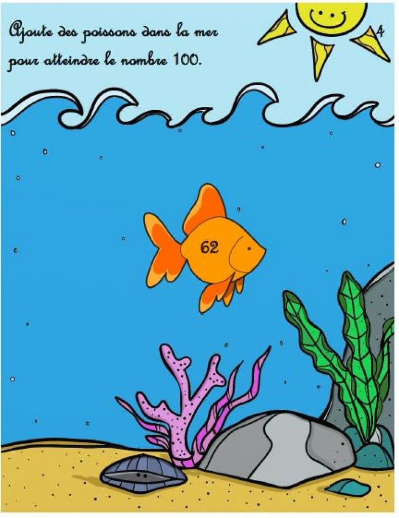 – Atelier 3 : Le jeux des poissons (jouable à 6 maximum : chaque joueur reçoit un plateau de jeu sur lequel figure un poisson avec un numéro, chaque joueur doit ajouter sur son plateau d’autres poissons pour atteindre le nombre 100).