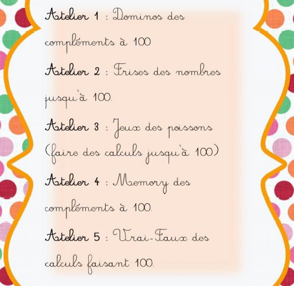 – Atelier 1 : Un jeu de dominos des compléments de 100 (Chaque joueur reçoit le même nombres de dominos. Chacun son tour, selon ses possibilités, les joueurs doivent poser un de leurs dominos pour compléter un complément à 100).