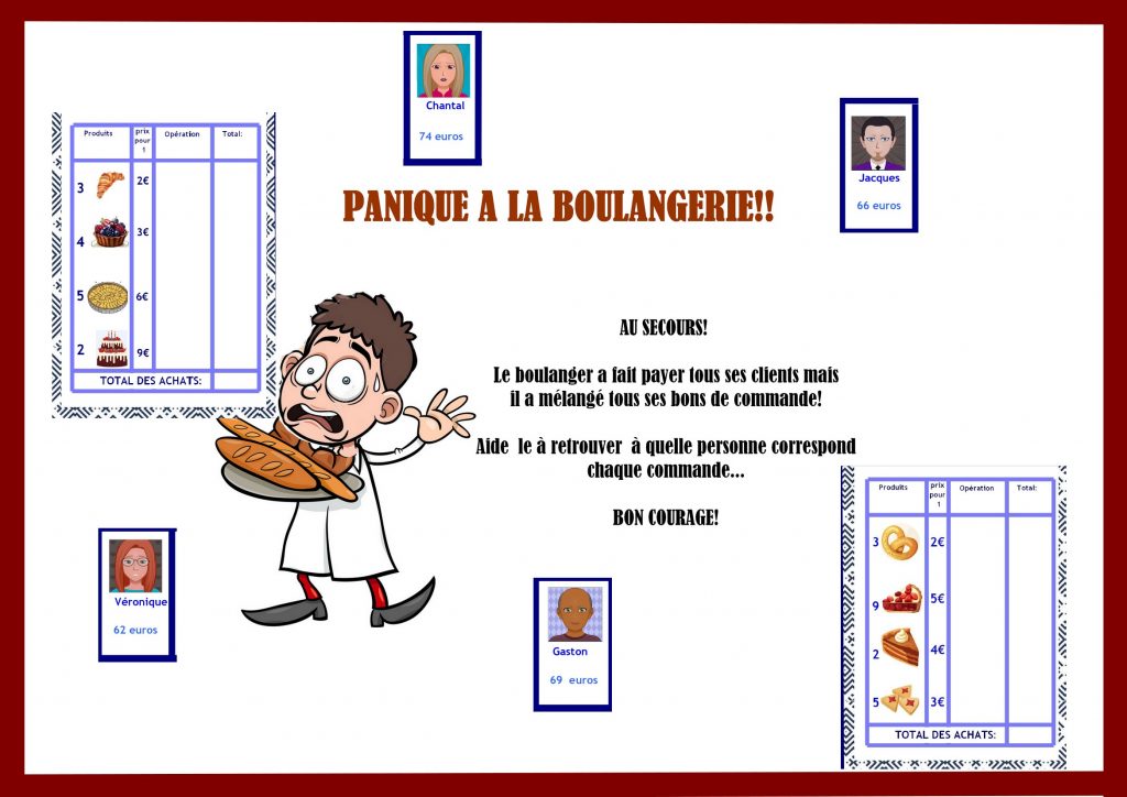 Atelier comprenant 20 bons de commandes (avec les opérations à poser pour calculer le prix total), 20 cartes clients avec le prix que chacun d’eux a payé.
