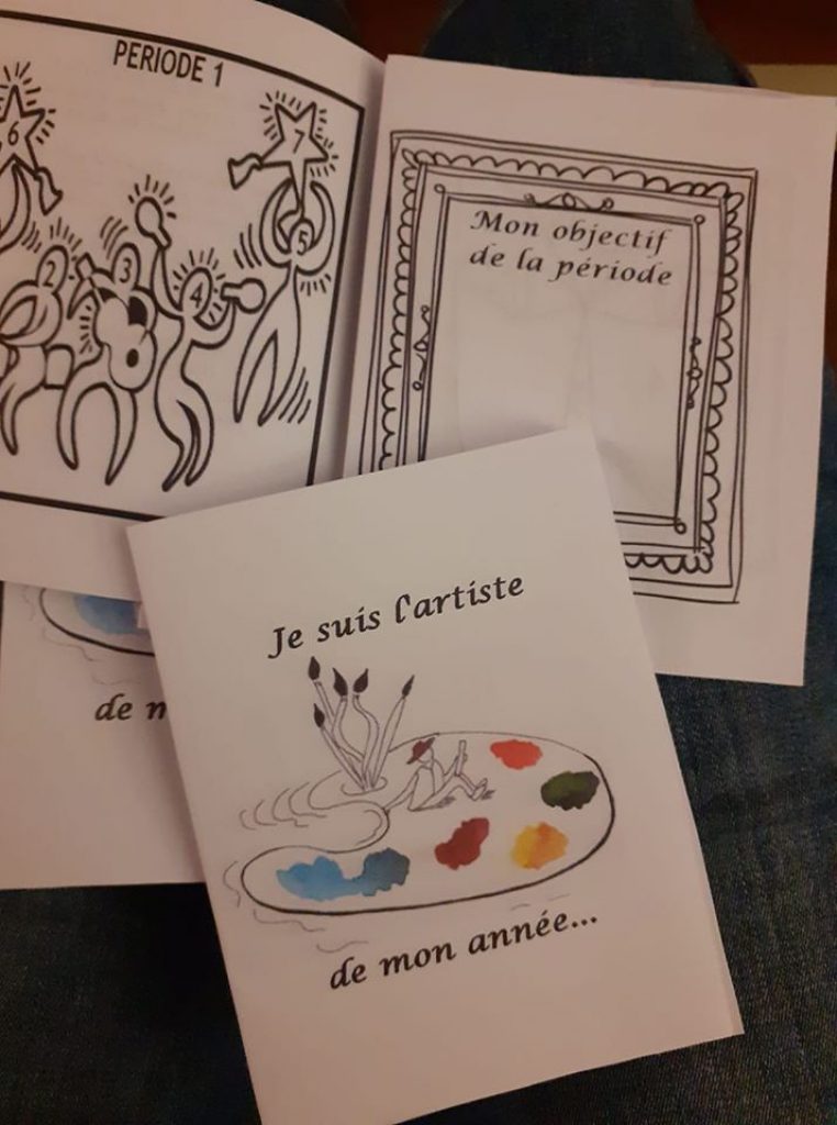 Pour chaque période, une oeuvre d’art avec un nombre d’éléments à colorier correspondant au nombre de semaines de la période. Si l’enfant est dans le vert en fin de semaine, il colorie l’élément en vert. Pour chaque période un tableau « objectif » pour cibler l’élément principal sur lequel l’élève doit faire des efforts. (bavarder moins, se mettre rapidement au travail,…)