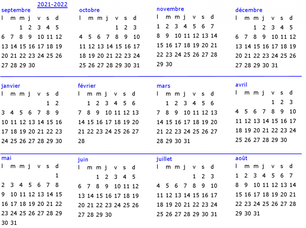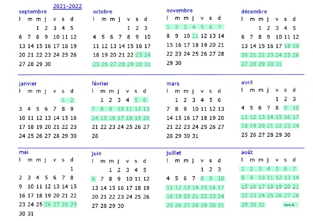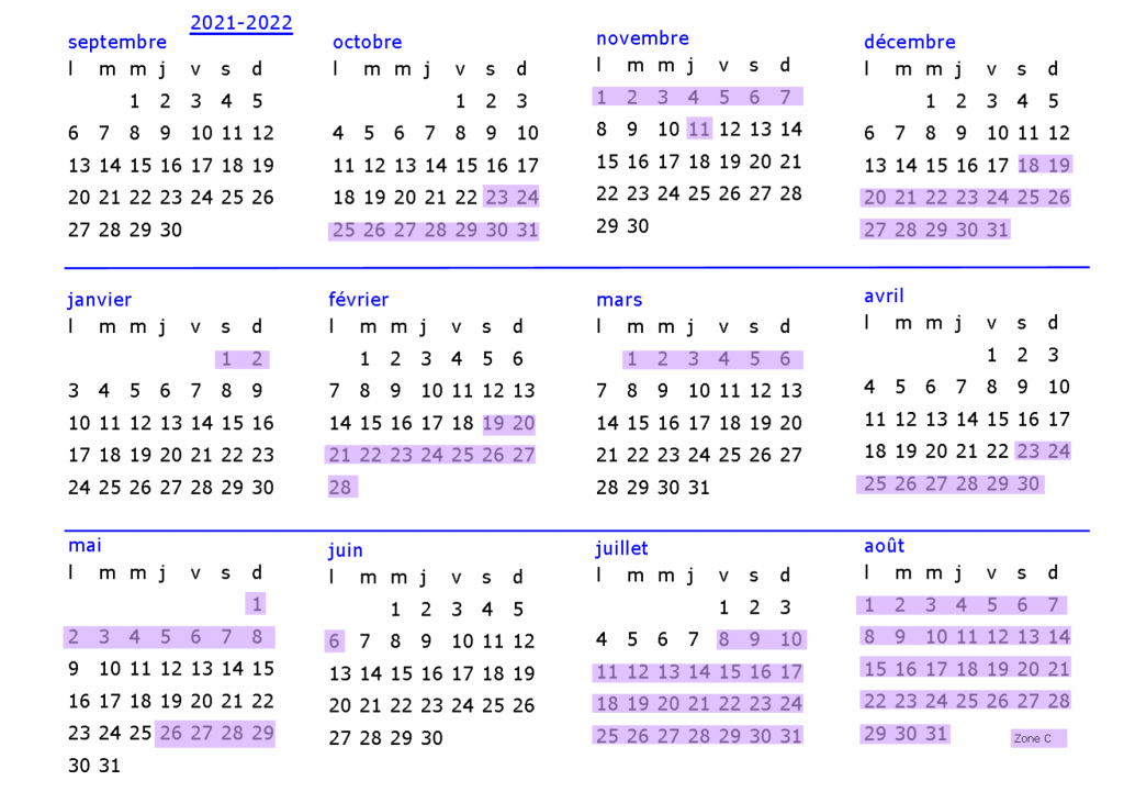 Choisissez votre planning annuel en fonction de votre zone A, B ou C et visualisez les trimestres de l’année avec les congés scolaires mis en couleur.