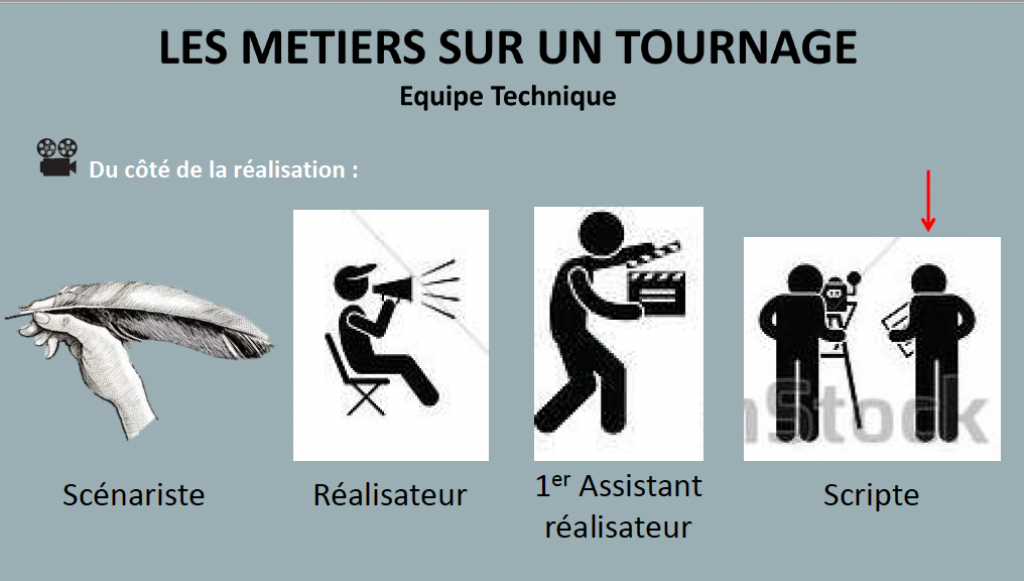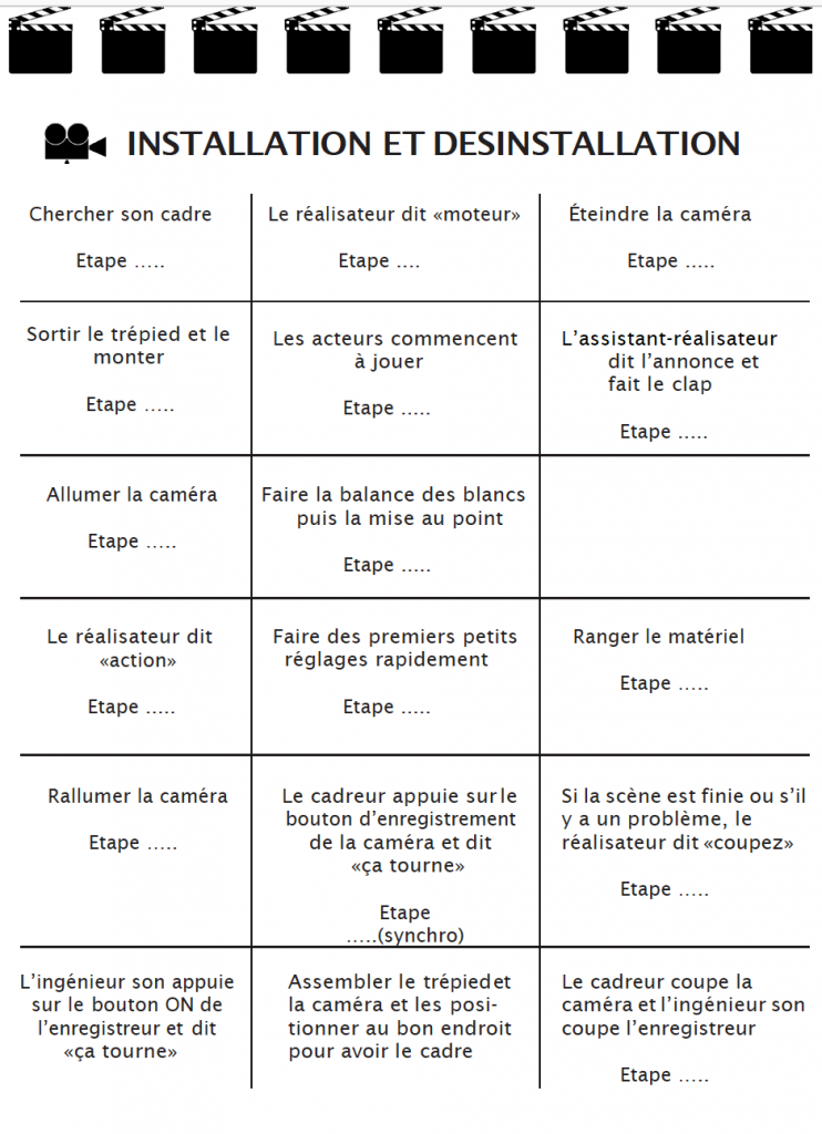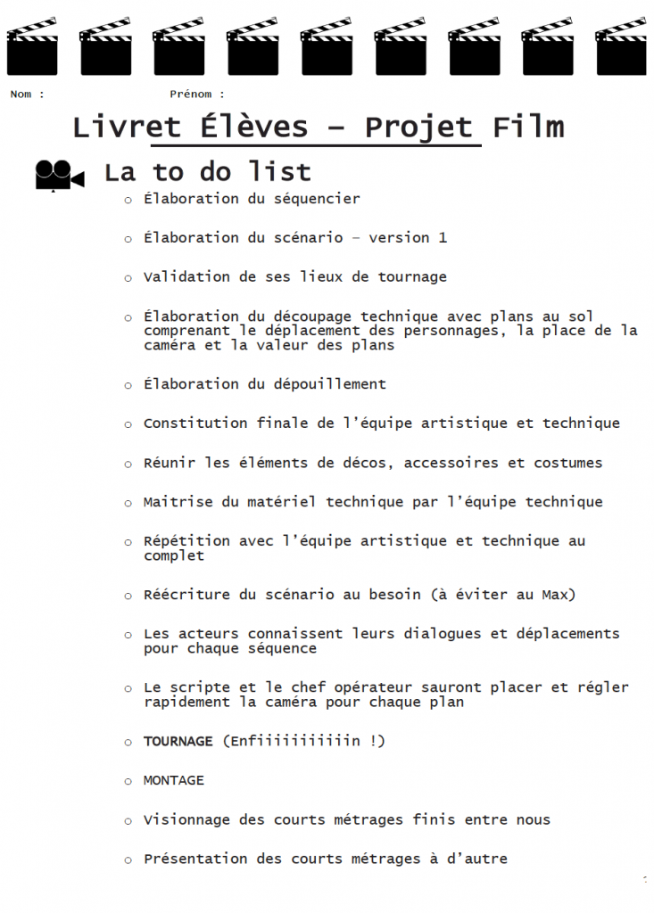 – Le livret élève en PDF et en version word, que les élèves doivent compléter en entier avant le tournage afin d’être totalement prêt. Il contient tout ce qu’il faut avoir pour préparer ce type de film avec les jeunes : séquencier, le scénario est plutôt à taper sur un ordinateur, les repérages pour les décors, la répartition des rôles, les plans au sol pour noter les déplacements et la place de la caméra, le dépouillement génale par séquence (costumes, accessoires, acteurs, rôles, décors,son…), un exemple de feuille de scripte. Un to-do liste au début du livret permet de visualiser l’avancée du projet et ce qu’il reste à faire.