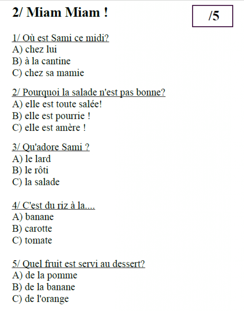 Les 18 questionnaires ont été rédigés avec un vocabulaire simple accessible aux lecteurs début de CP, entre novembre et février. Chaque enfant doit lire son roman, puis il a 5 questions avec trois réponses possibles (A, B ou C). Il n’a plus qu’à rechercher la réponse dans le livre si besoin, et à entourer la bonne lettre.