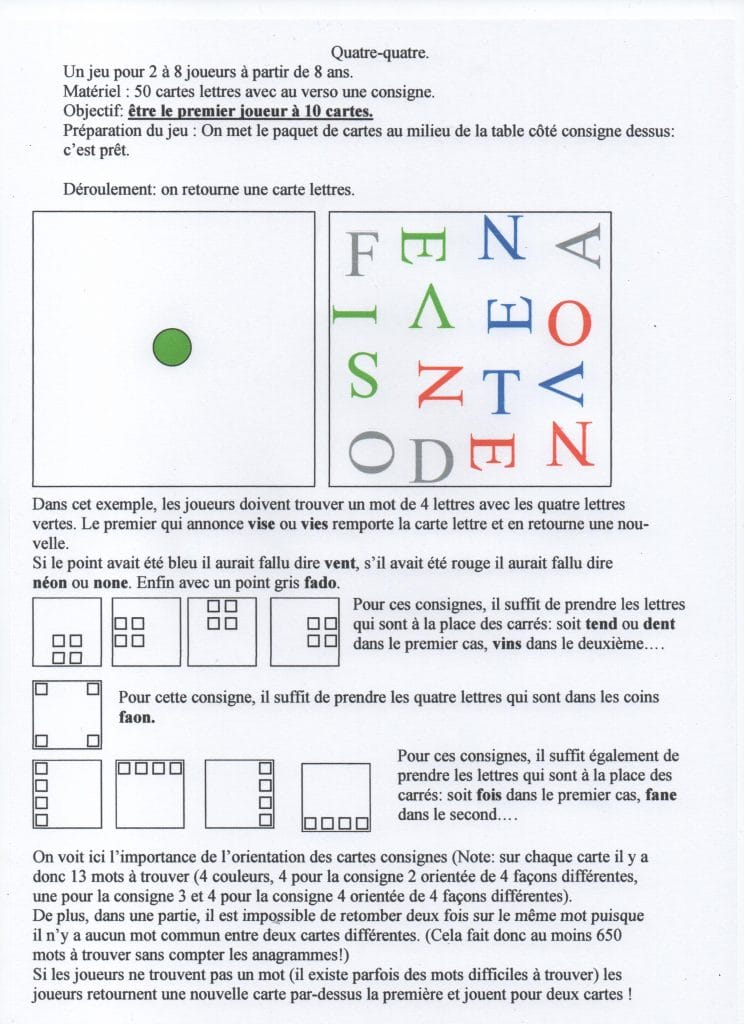 Jeu sur les mots de quatre lettres. A partir d’une consigne, les joueurs doivent trouver le mot de quatre lettres.
