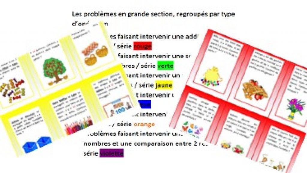 Vous recevrez 6 pages contenant chacune 9 cartes « problème », réparties par couleur (pour différencier les différents problèmes à résoudre), et une page supplémentaire explicative destinée à l’enseignant(e) . A imprimer, plastifier, et utiliser directement! les élèves peuvent être munis de matériels de manipulation, tels cubes, jetons, etc.… pour la résolution, et une feuille où il note ses résultats, ou il les donne à l’oral suivant son niveau en écriture des chiffres.