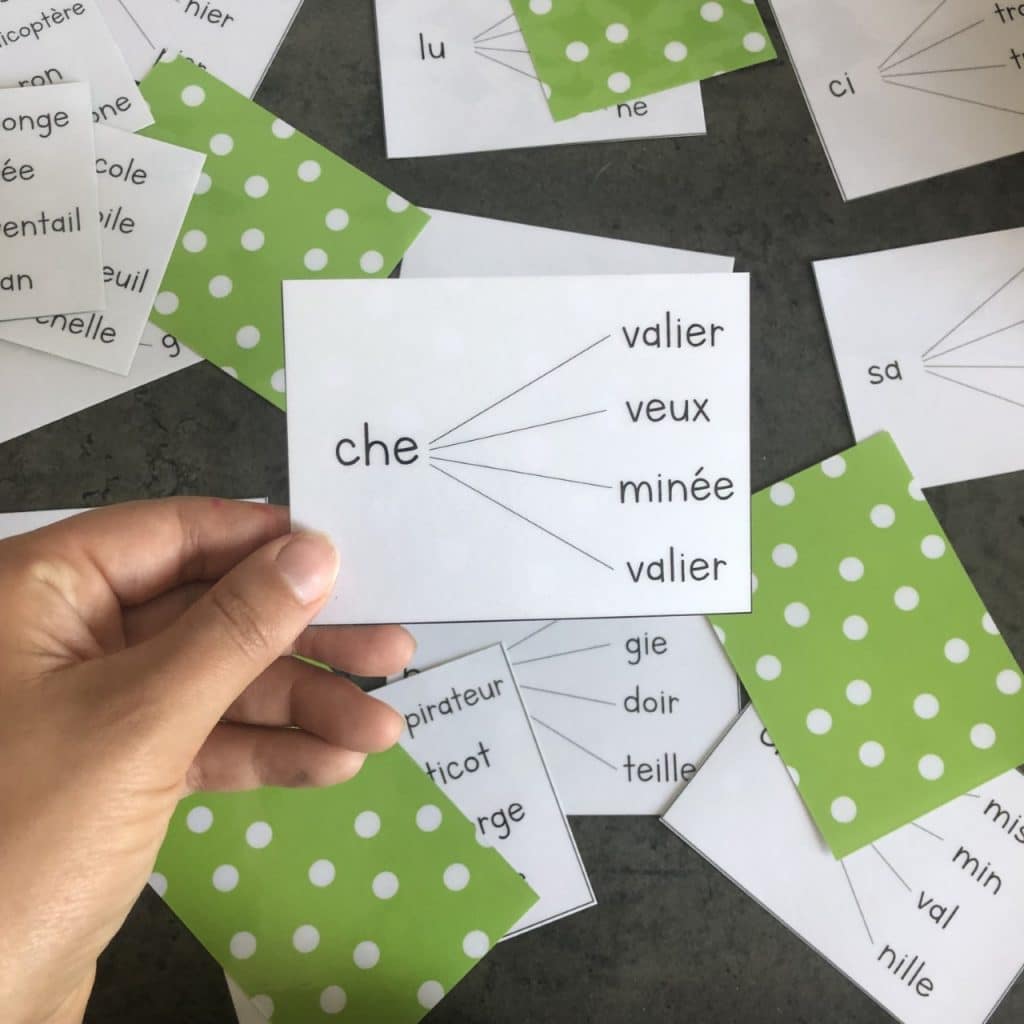 L’enfant prend une carte et lit les mots qui commencent par la même syllabe d’attaque.