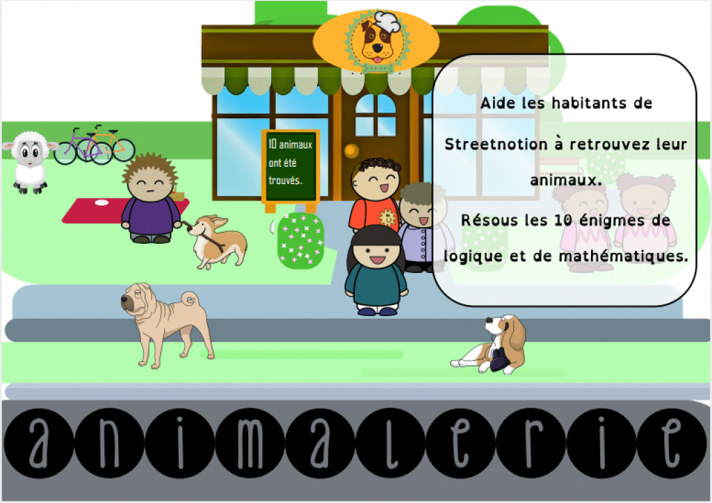 Ce jeu est a utiliser en atelier individuel ou en classe entière lors des rituels. Il fait partie d’un projet pédagogique autour de la ville Streetnotion. Chaque lieu de la ville permet de travailler une ou plusieurs notions. Je vous présente ici l’animalerie où les enfants doivent résoudre des énigmes de logique et de mathématiques simple (dès CE2).