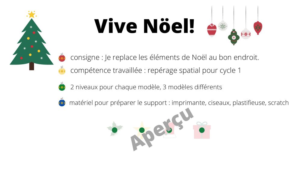 Jeu de répérage spatial : rescratcher les éléments de Noël au bon endroit comme sur le modèle. Un premier niveau avec les dessins encore présents en filigrane et un deuxième niveau ou seuls les emplacements des éléments sont marqués.