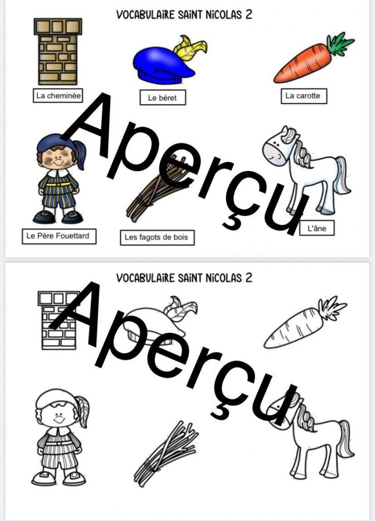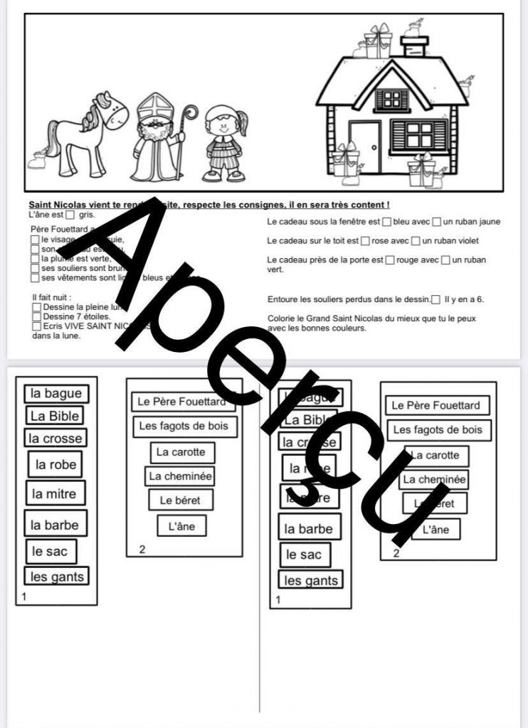 Voici un exercice sur Saint Nicolas, qui pourra permettre aux enfants de CP / CE1 (première et deuxième primaire) de réviser le vocabulaire de Saint Nicolas et de travailler la lecture de consignes. [Peut être utilisé également en maternelle avec le référentiel accessible à l’enfant.]